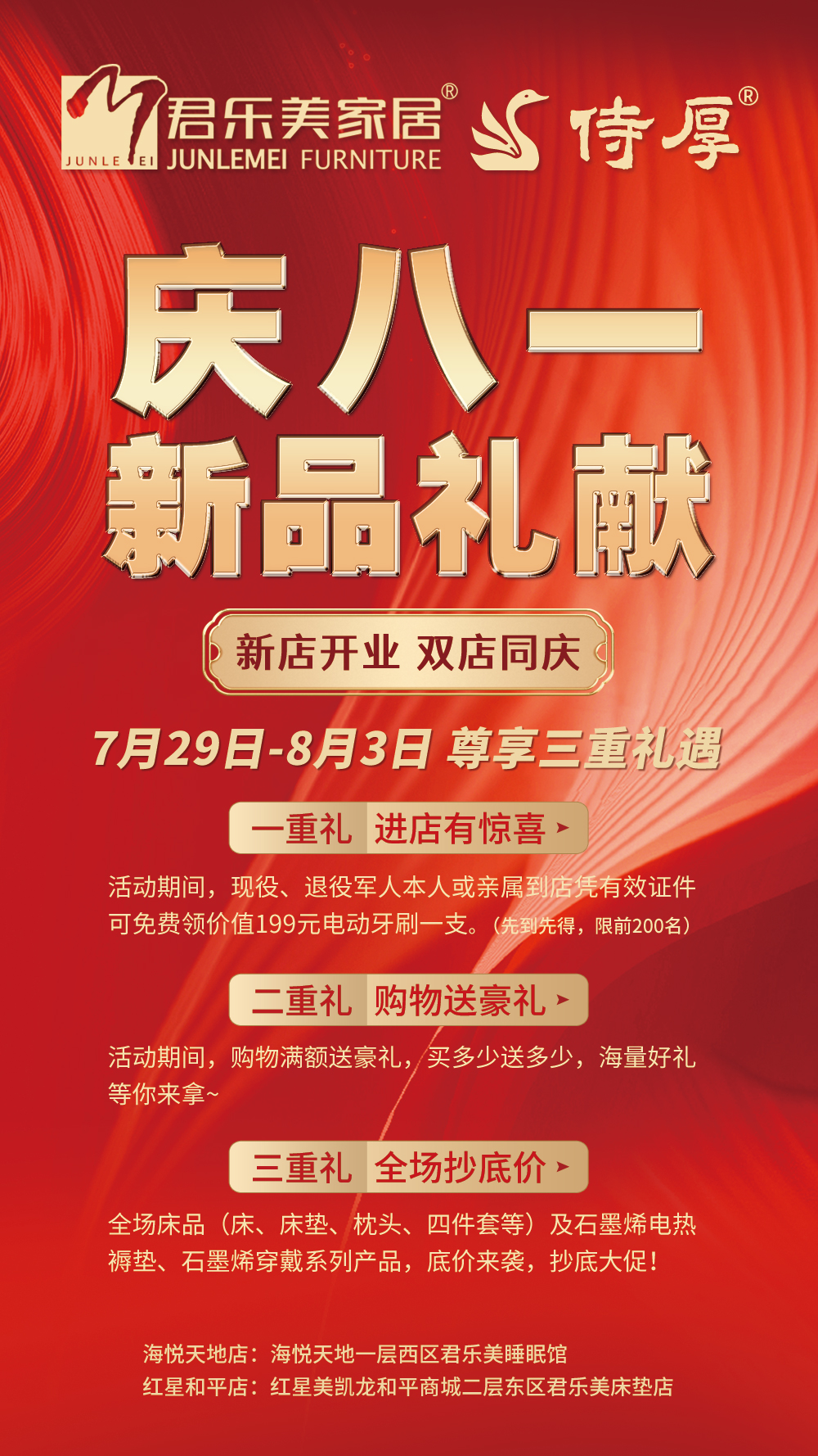 八一建軍節(jié)馬上要到了,向最可愛的人致以最崇高的尊崇,石家莊君樂(lè)美雙店聯(lián)動(dòng)送豪禮,1.進(jìn)店有驚喜2.購(gòu)物送豪禮3.全場(chǎng)抄底價(jià)。