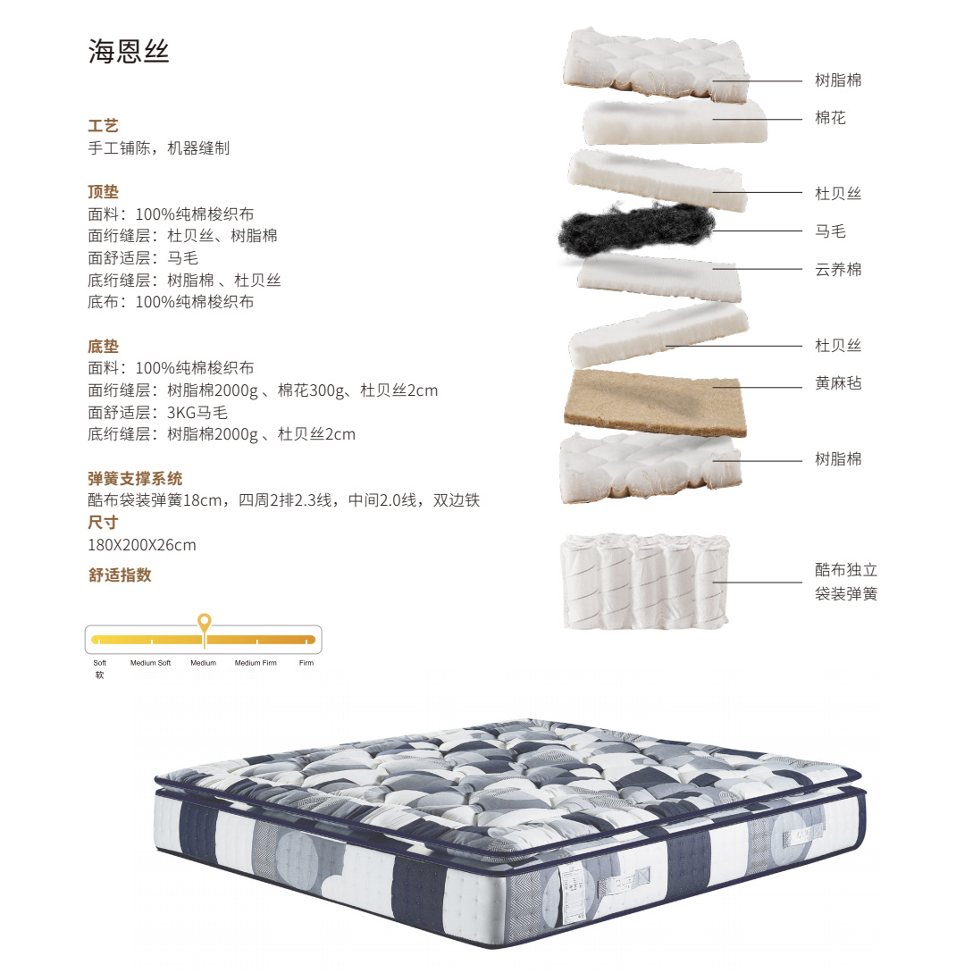 這張床墊由匠人親手縫制側(cè)邊針腳精密加固,確保長(zhǎng)久耐用。天然選材,0膠水添加,健康安心,精選高透氣、吸濕性強(qiáng)的天然材質(zhì),躺下瞬間,身體被溫柔承托。頂墊包裹感極佳,仿佛墜入云朵般柔軟,卻又不失支撐力,整夜安眠不塌陷。